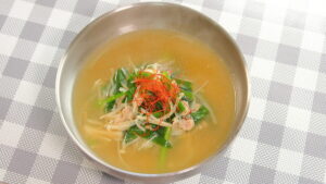 ちょっと風変わりなスープですが、塩昆布の塩味と旨味がスープに溶け込み、お豆腐と卵が絡んでさっぱりした中にも食べごたえのあるスープになりました。