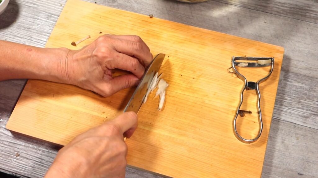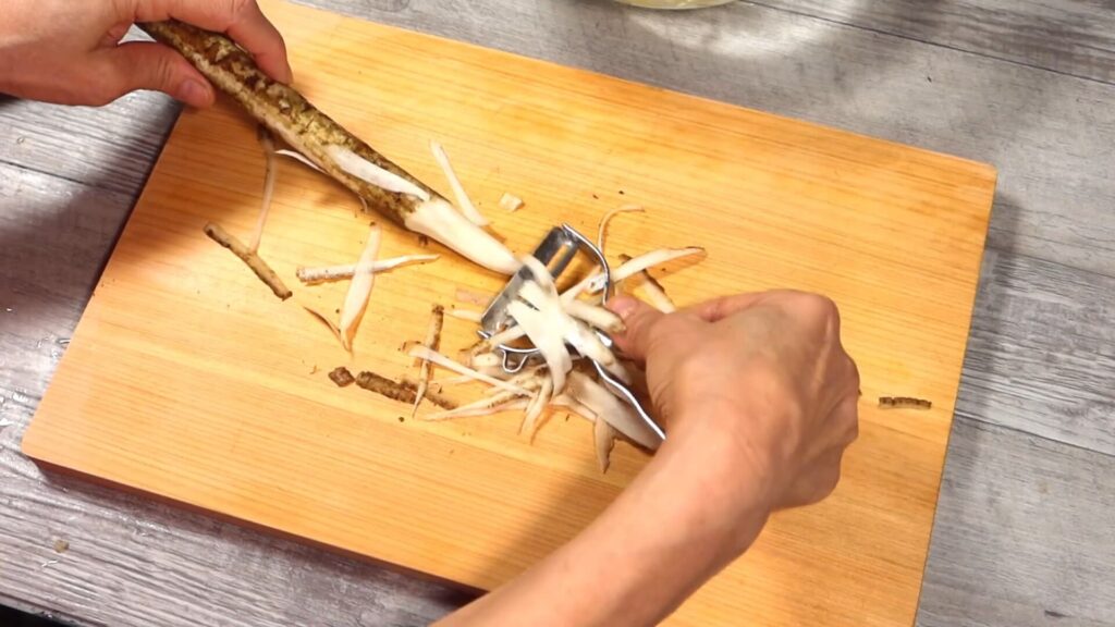 ①ごぼうはささがきごぼうにして、水に漬けアクを抜いておきます。