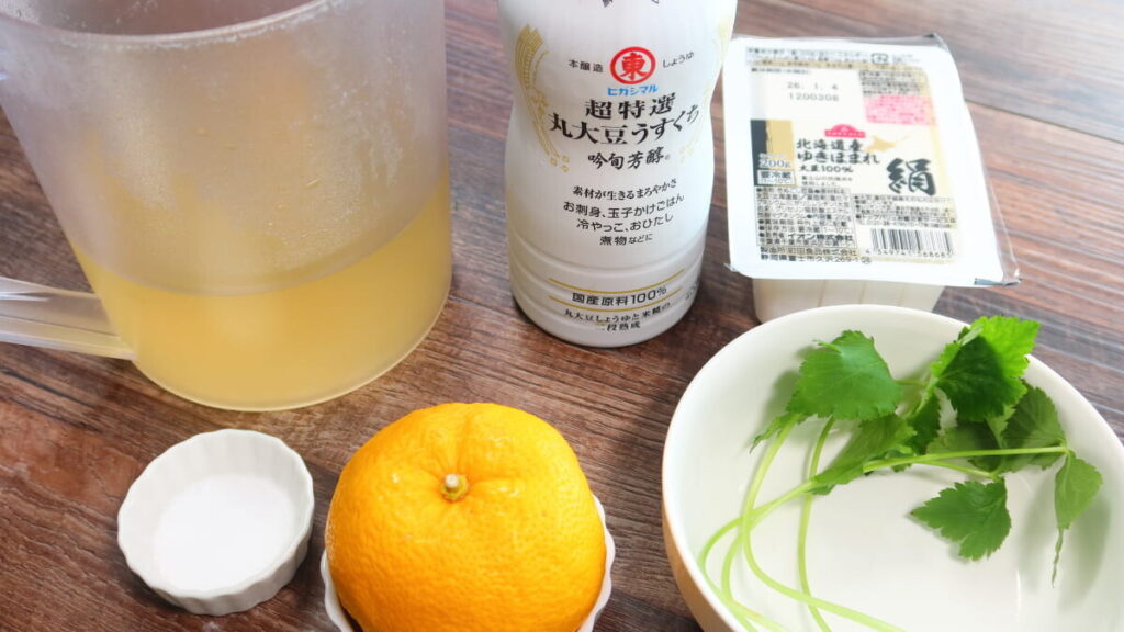 | 【材料2人分】70kcal/人 ・絹豆腐4~5cm角2個 ・糸三つ葉 8本 ・黄柚子(皮) 少々 ・出汁 600ml ・塩 小1 ・醤油 小1/2 |