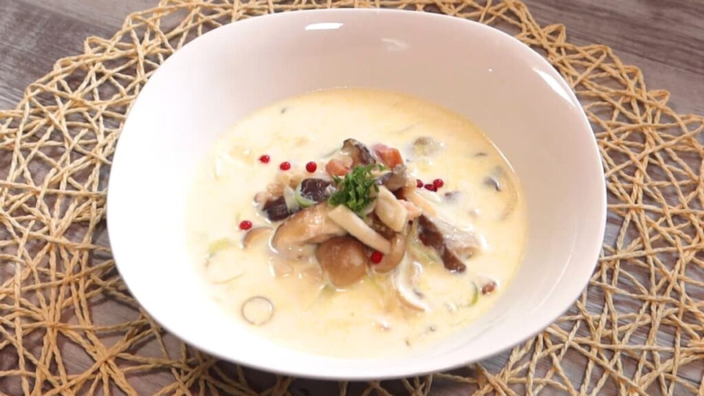 【きのこたっぷりホワイトスープレシピ】ミルクの優しい甘味と きのこの香りと旨味が溶け合った贅沢なスープ【512kcal】